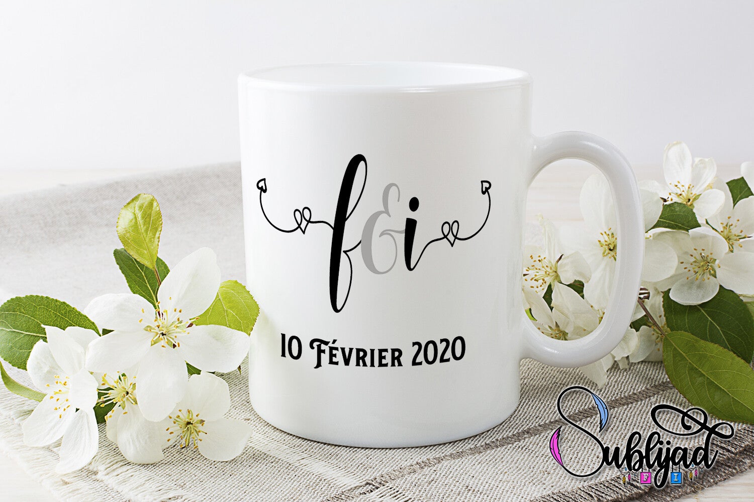 Mug Tasse personnalisée avec les initiales et la date de votre choix. Cadeau mariage fiançailles anniversaire Saint-Valentin ….